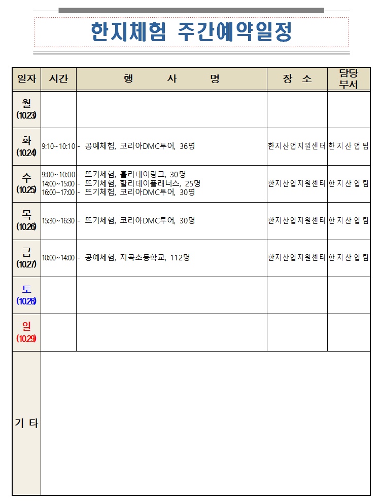 한지체험 주간예약일정 10.23 ~ 10.29